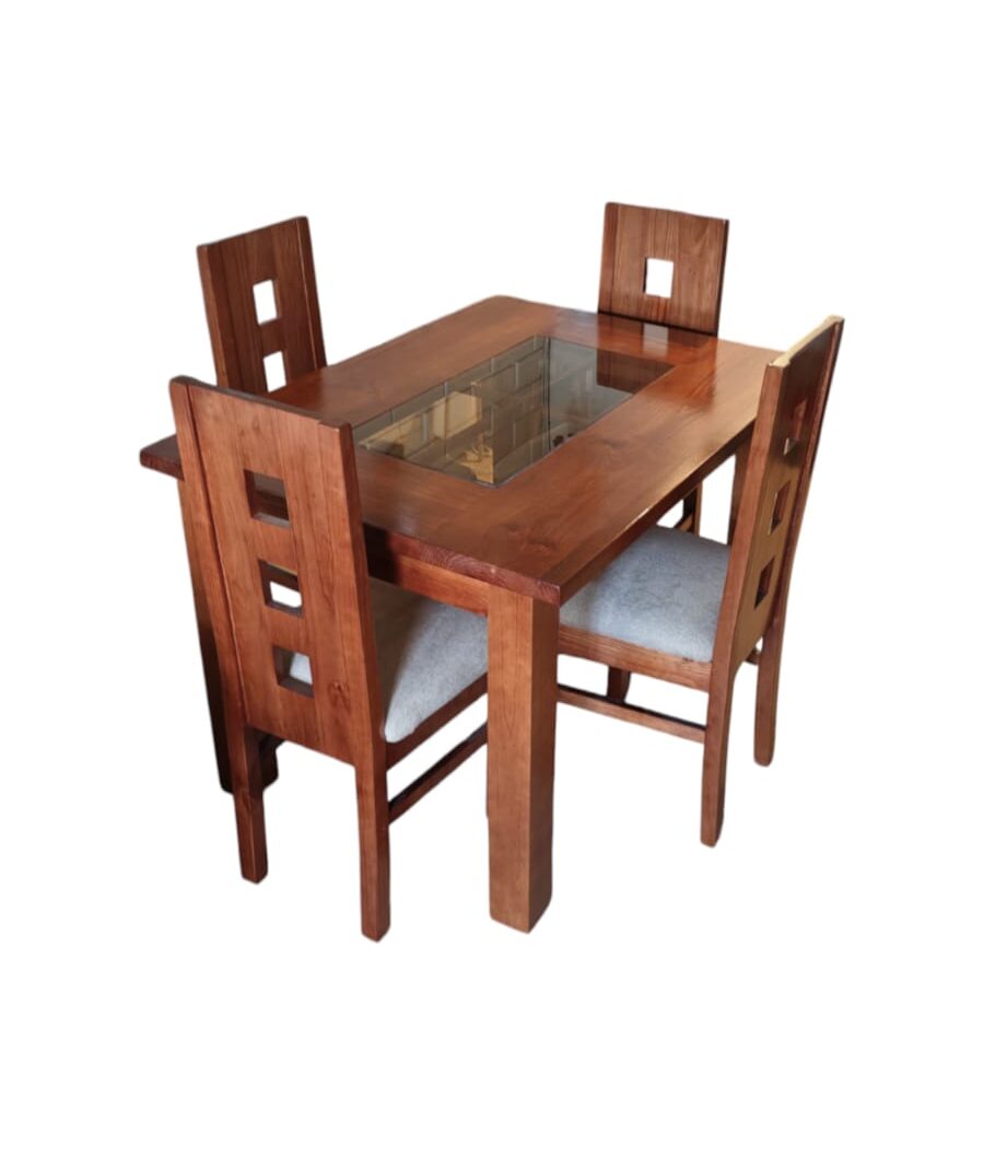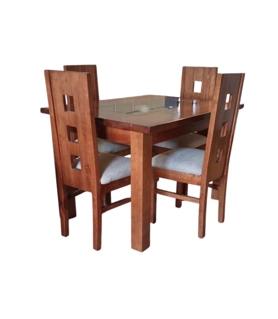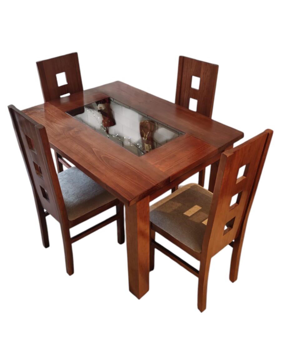 Cubierta, casco y patas de la mesa son 100% madera maciza, el centro de la cubierta lleva un vidrio Ahumado para una estética diferente y única.