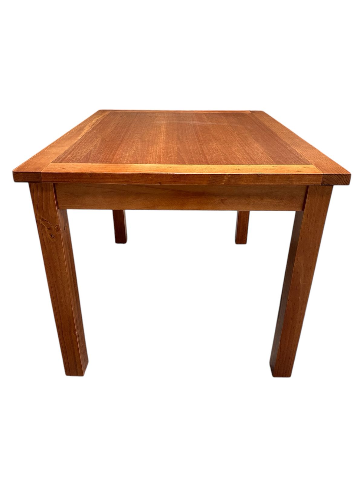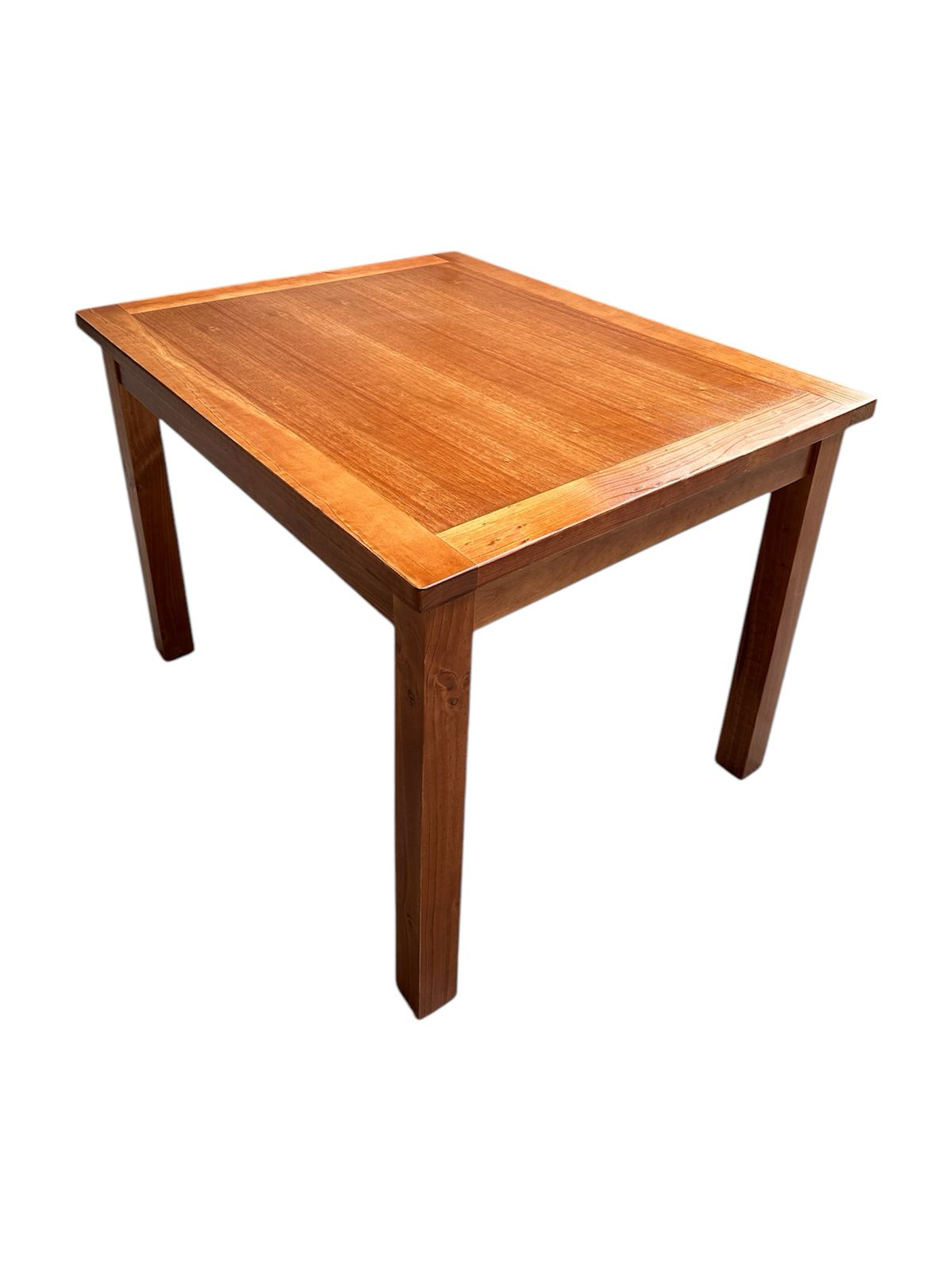 Marco, casco y patas de la mesa son 100% madera maciza, el centro de la cubierta lleva una placa de aglomerado de eucalipto.