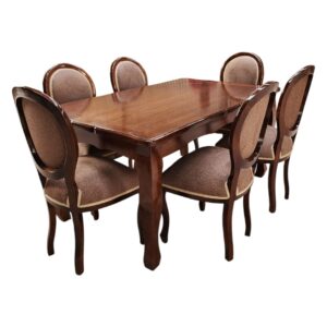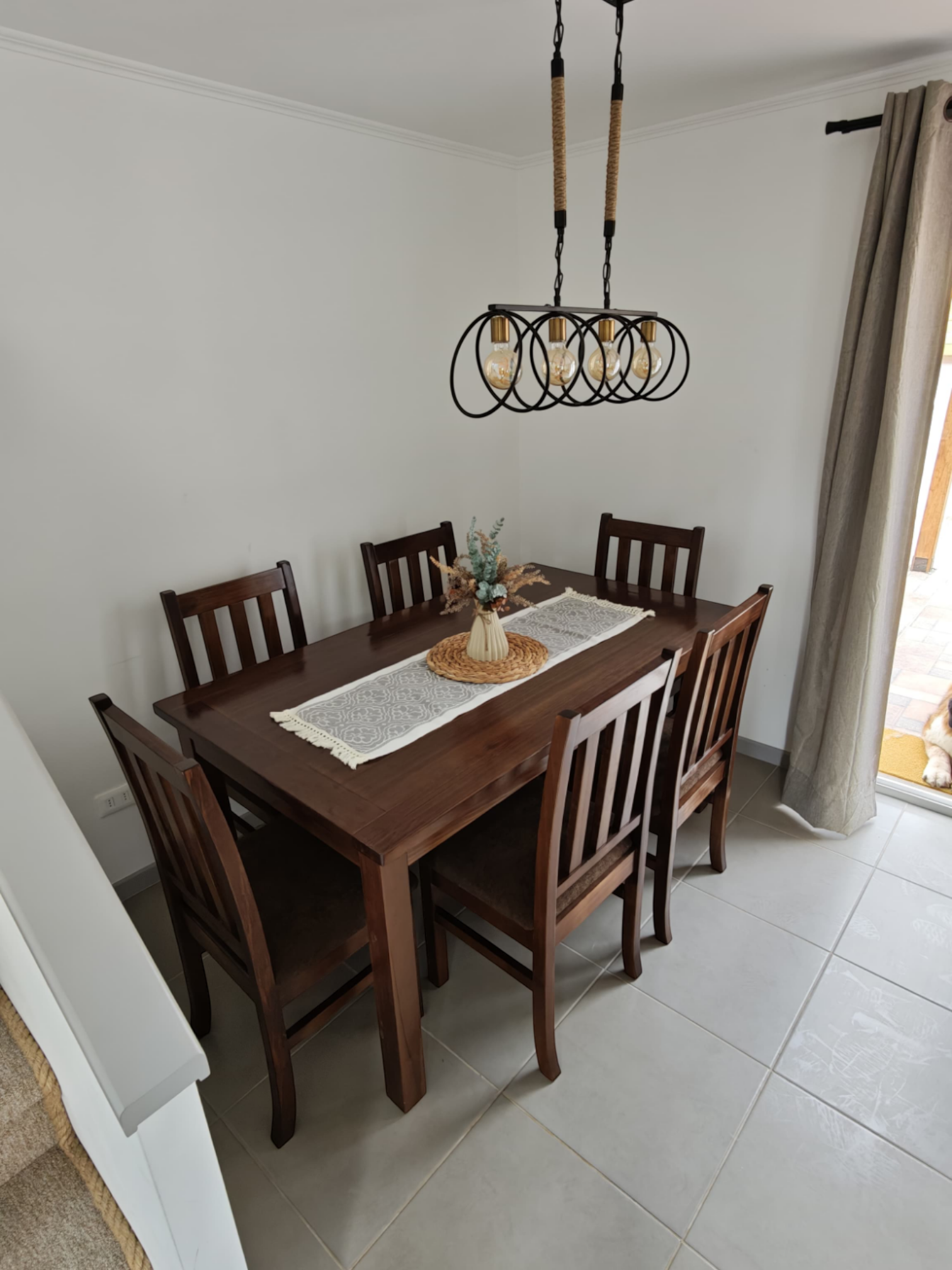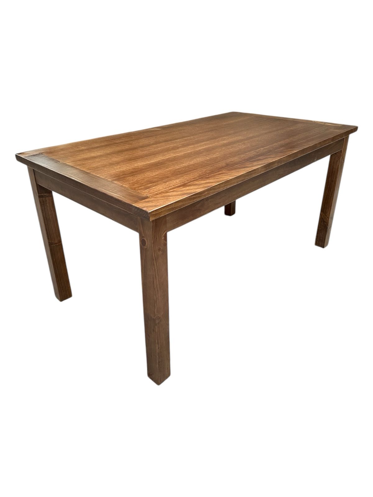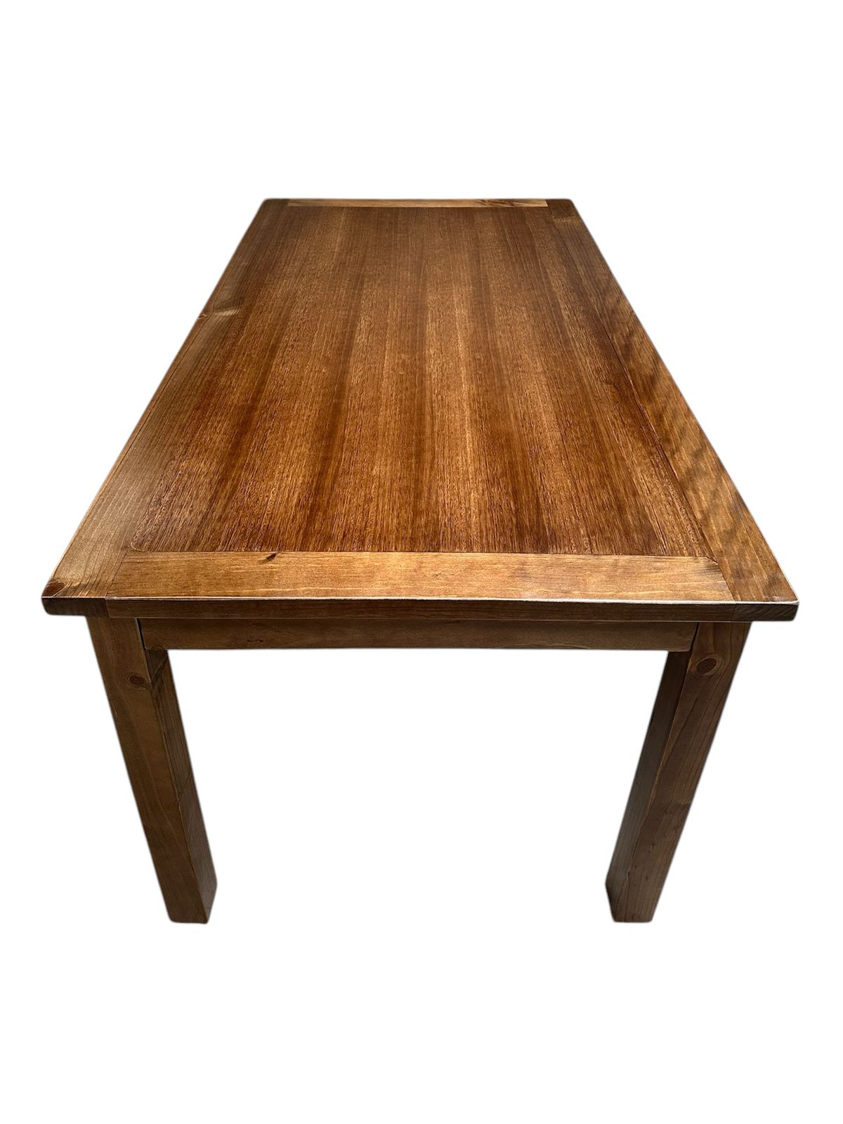 Marco, casco y patas de la mesa son 100% madera maciza, el centro de la cubierta lleva una placa de aglomerado de eucalipto.