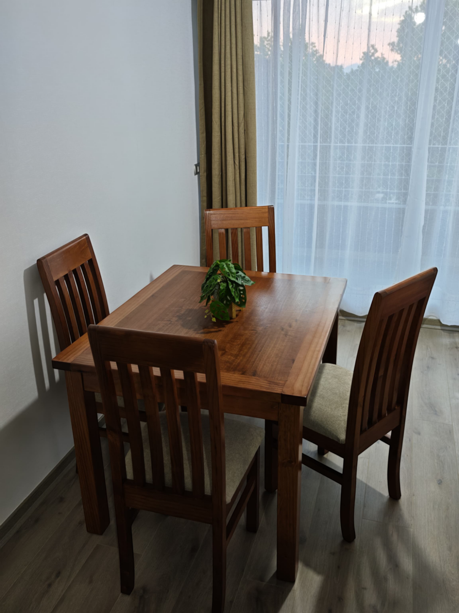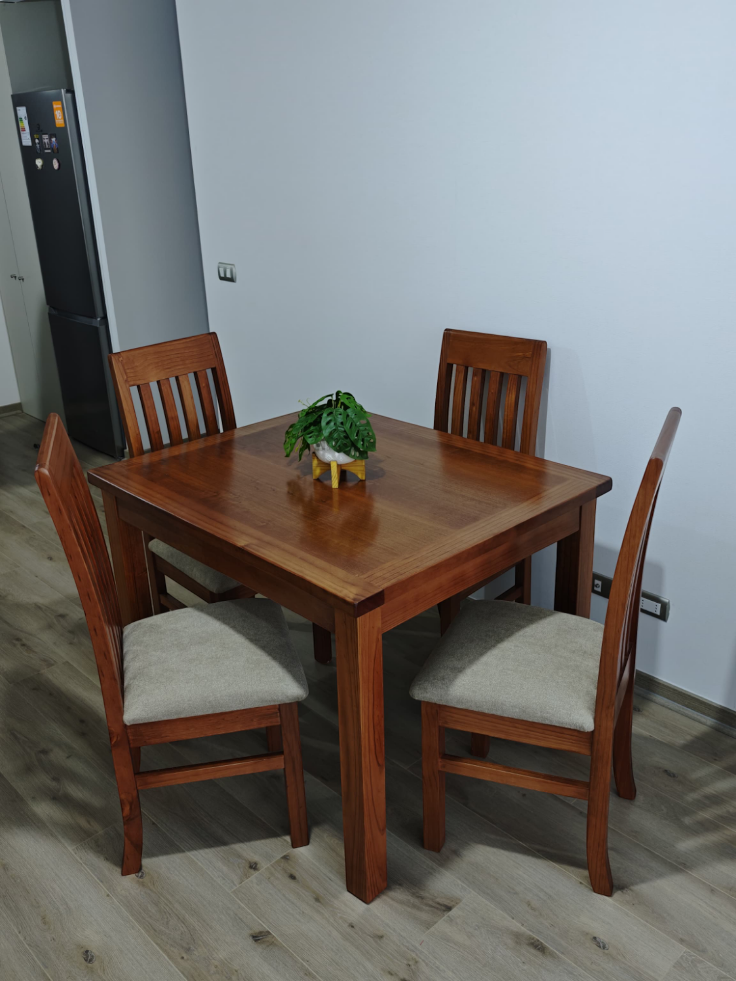 Marco, casco y patas de la mesa son 100% madera maciza, el centro de la cubierta lleva una placa de aglomerado de eucalipto.